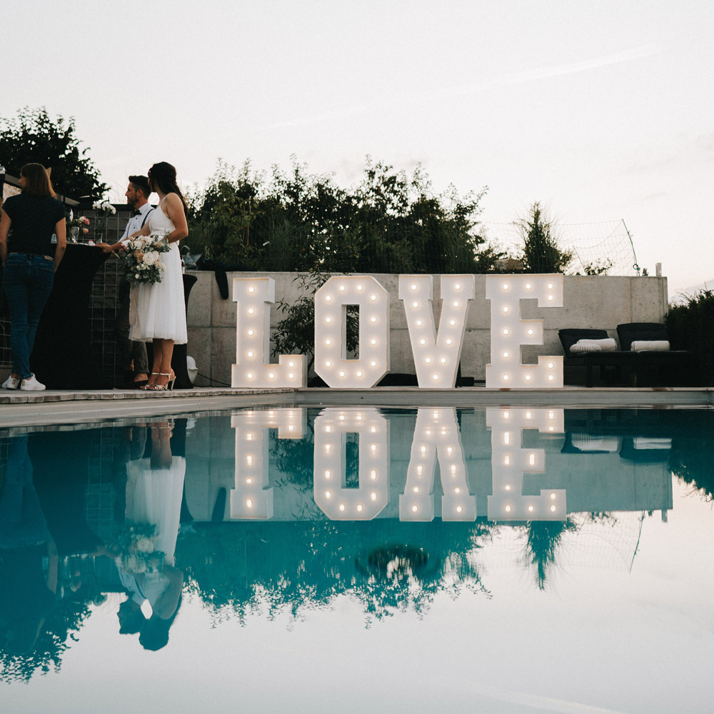 Unsere LOVE-Buchstaben lassen sich stufenlos dimmen – von strahlend hell für die Fotos, bis zurückhaltend glimmend für die Party.